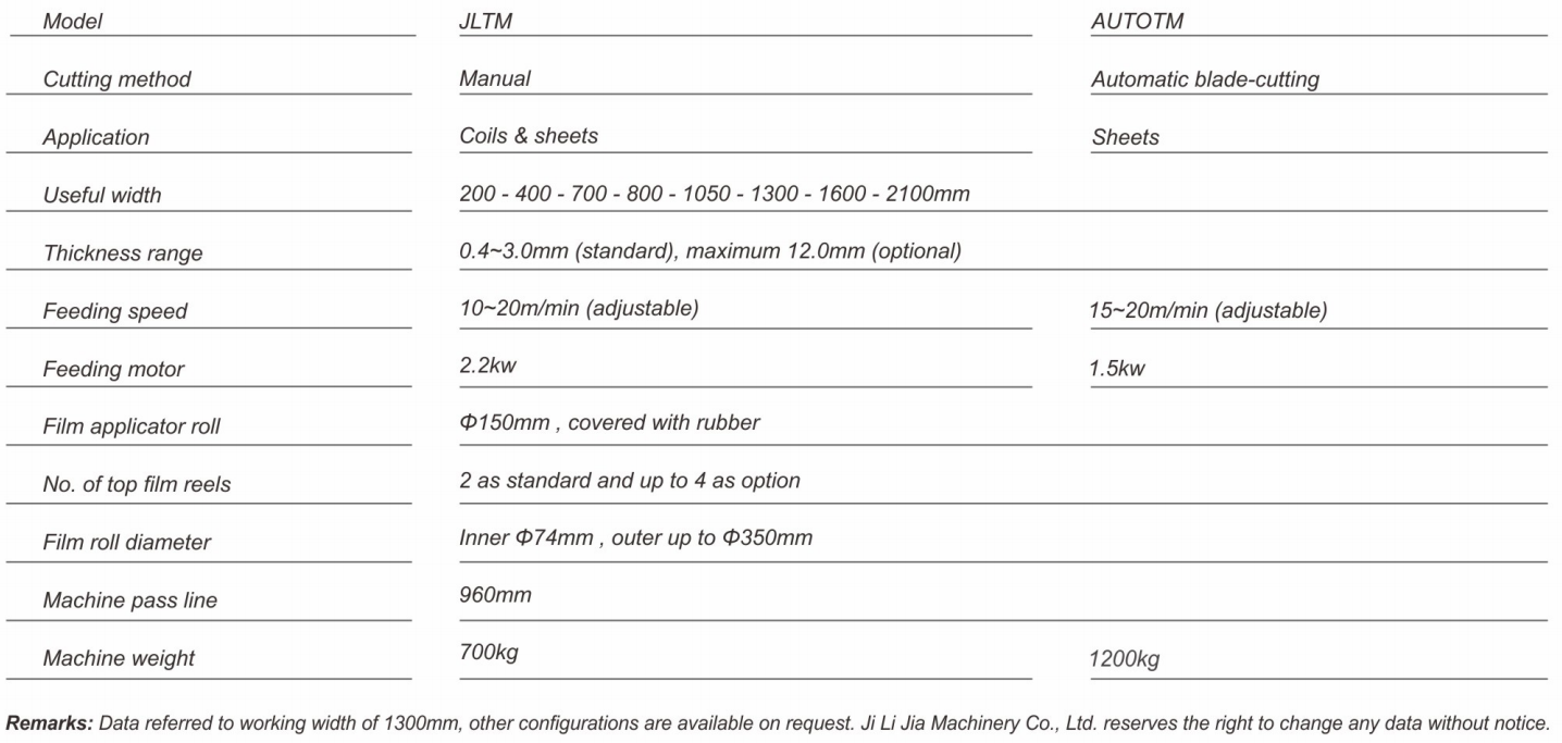 - JLTM semi-automatic laminating machine, user needs to cut the protective film manually, which is suitable for simple sheet-to-sheet lines and ideal for the highest efficiency coil-to-coil lines.