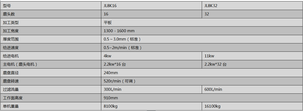 JL8K鏡面拋光機為單機16磨頭,客戶可根據產能的要求配置多臺單機,組成鏡面拋光生產線。過濾系統(選購)可以將磨料混合物從金屬廢屑中過濾出來,回收利用。清洗和烘干設備(選購)可為板材表面最終貼膜處理做好準備。